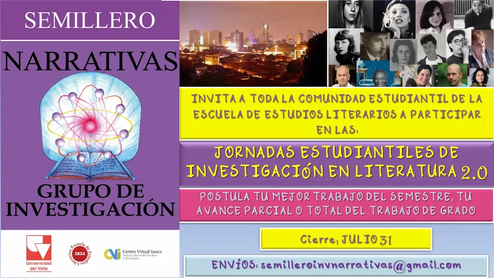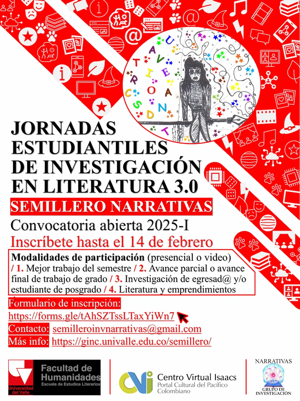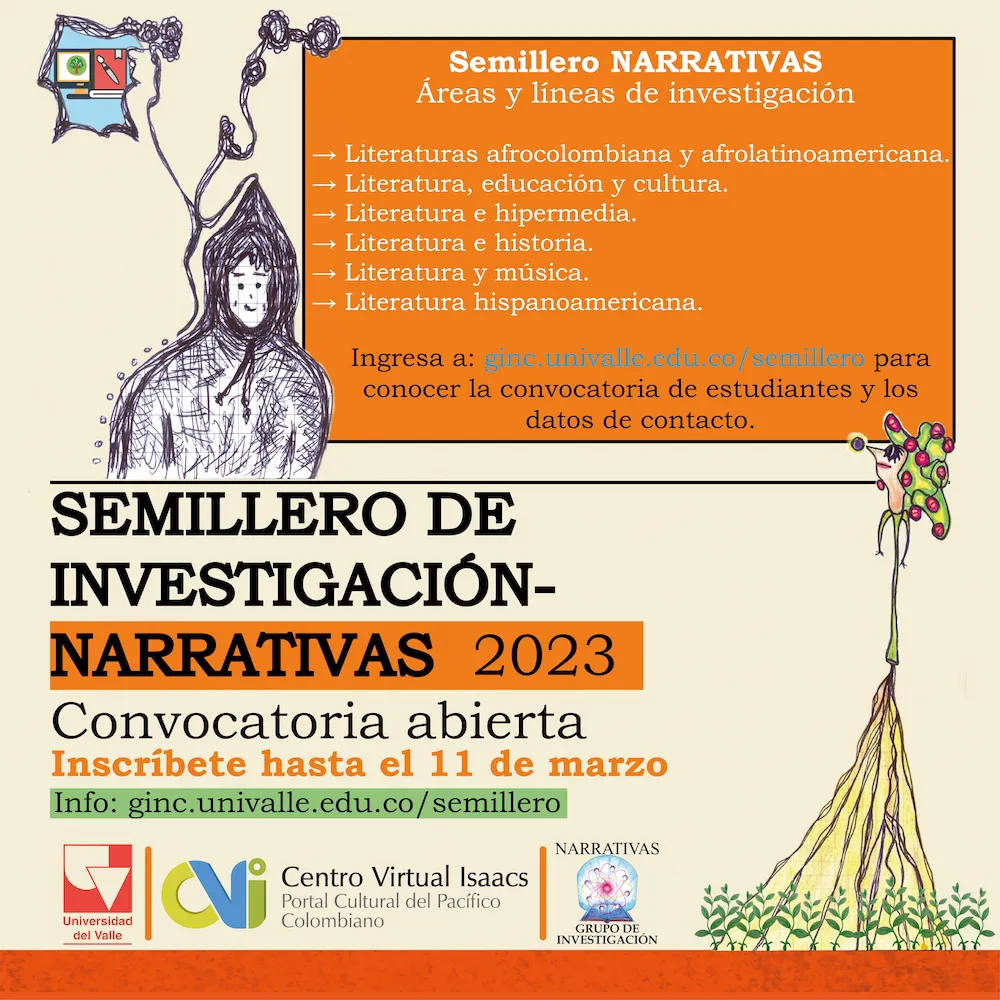 El semillero de investigación del grupo Narrativas, adscrito a la facultad de humanidades de la Universidad del Valle, a la Escuela de estudios literarios y al Centro Virtual Isaacs (Portal Cultural del Pacífico Colombiano), brinda a cada estudiante-investigador, de pregrado, maestría, doctorado, de la Universidad del Valle o de otras universidades, la oportunidad de escoger un tema acorde a las áreas de interés del semillero y en compañía de un@ tutor@ y de l@s demás participantes, desarrollar una investigación de manera autónoma, automotivada la cual debe arrojar unos resultados de trabajo en el proyecto final y en la exposición de estos resultados.